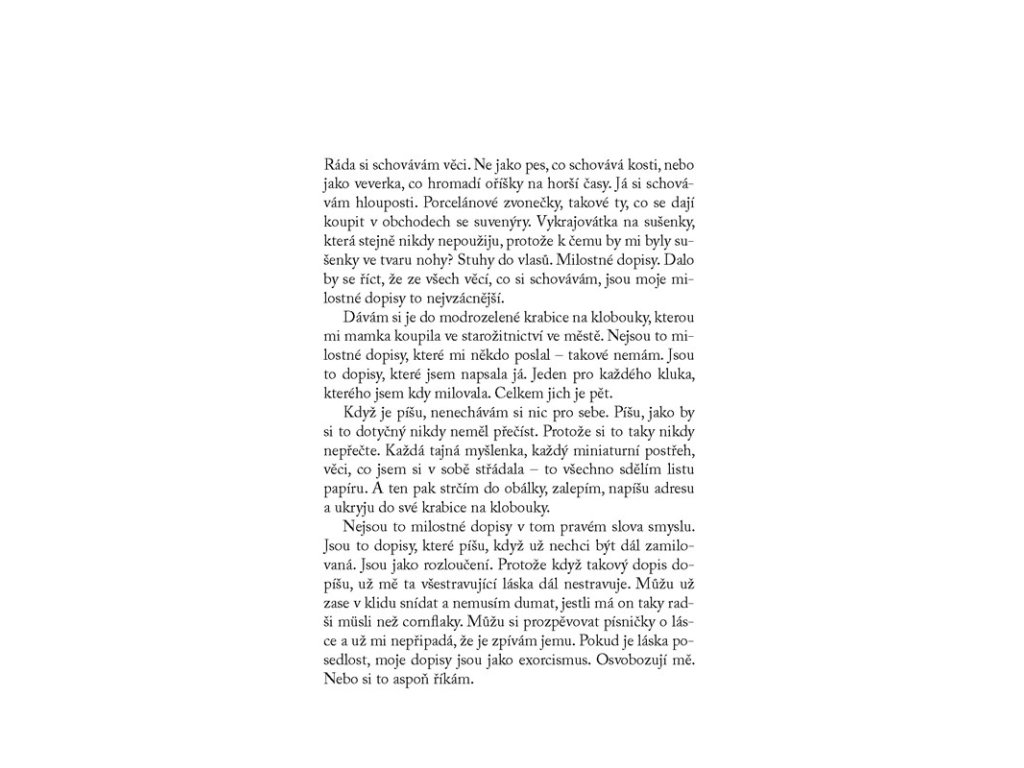 Co by se stalo, kdyby všem klukům, kteří se ti líbili, někdo najednou sdělil, že ses do nich zamilovala…? Milostné dopisy mají mnoho podob. Lara nikdy žádný nedostala, ale pár už jich napsala. Nikdy nedala žádnému klukovi najevo, že ho má ráda. A když už nechtěla být zamilovaná, napsala dopis o tom, jak se cítí, pečlivě ho zapečetila a schovala do krabice pod svou postelí. Ale jednoho dne dopisy z krabice zmizí a Lara zjistí, že je někdo rozeslal…